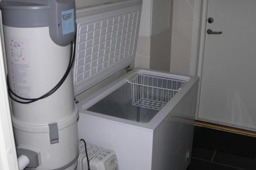 1 Bad mit Waschtisch, Dusche, WC, Fußbodenheizung , separat im Nebenraum Waschmaschine, Trockner, 1 großer Wirtschaftsraum/ Stauraum für Floatinganzüge, Angelgeräte etc., große Kühltruhe, Zentralstaubsaugeranlage, eigener Eingang,