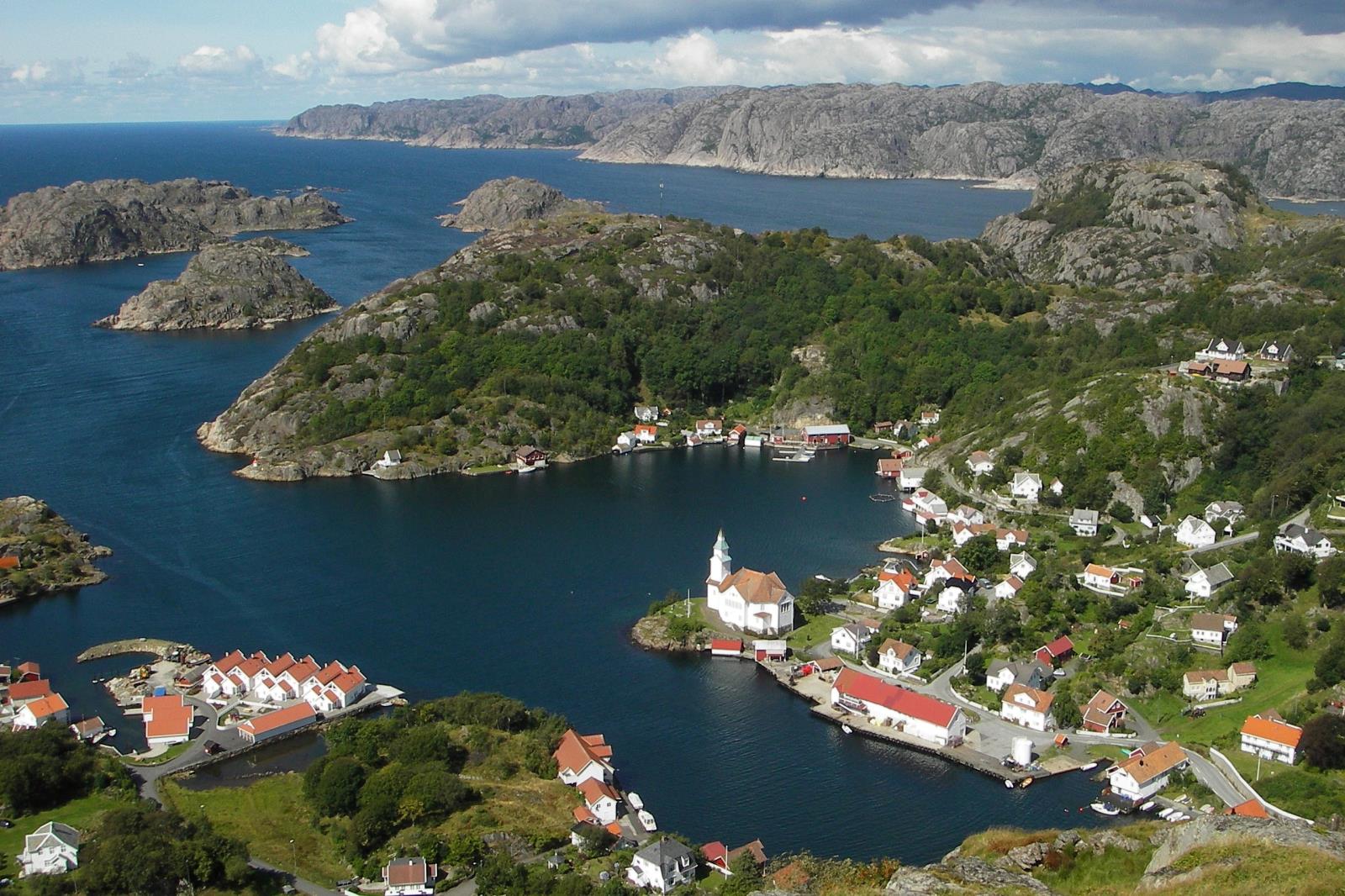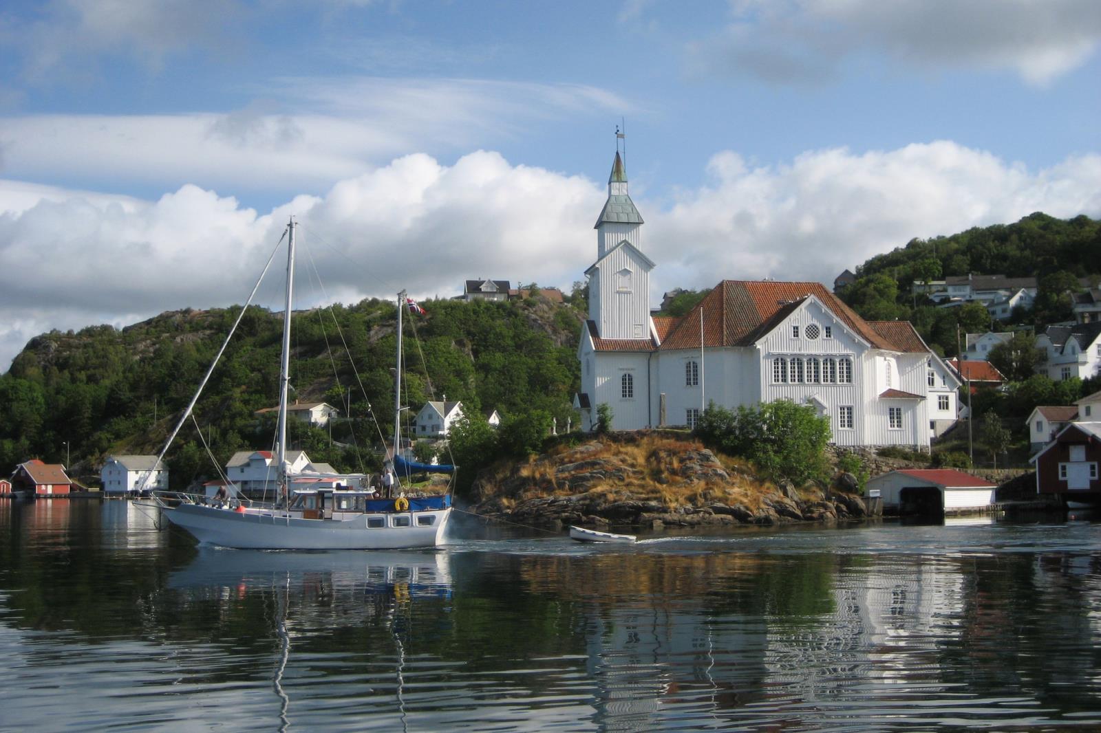 Weiter auf Hidra: Nach Verlassen der Fähre auf Hidra folgen sie der Straße bis nach Eie. An der Abzweigung in Höhe Brücke nach rechts abbiegen und etwas weiter in Richtung Kirkehamn / Kirkehavn fahren.