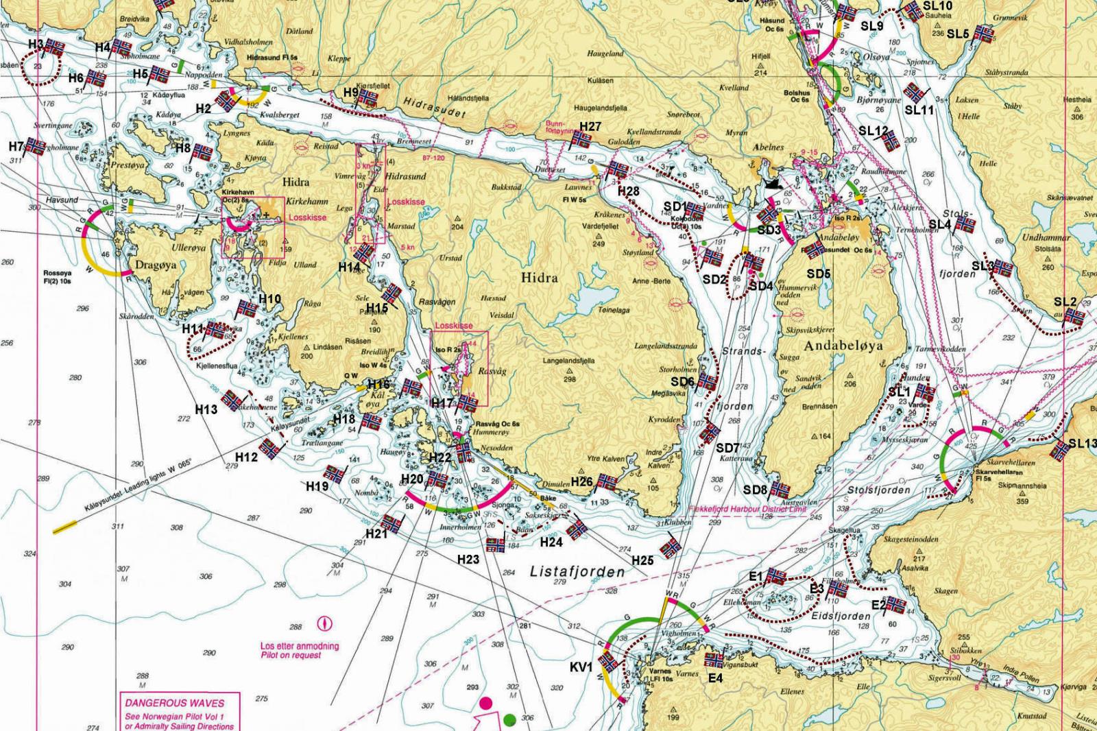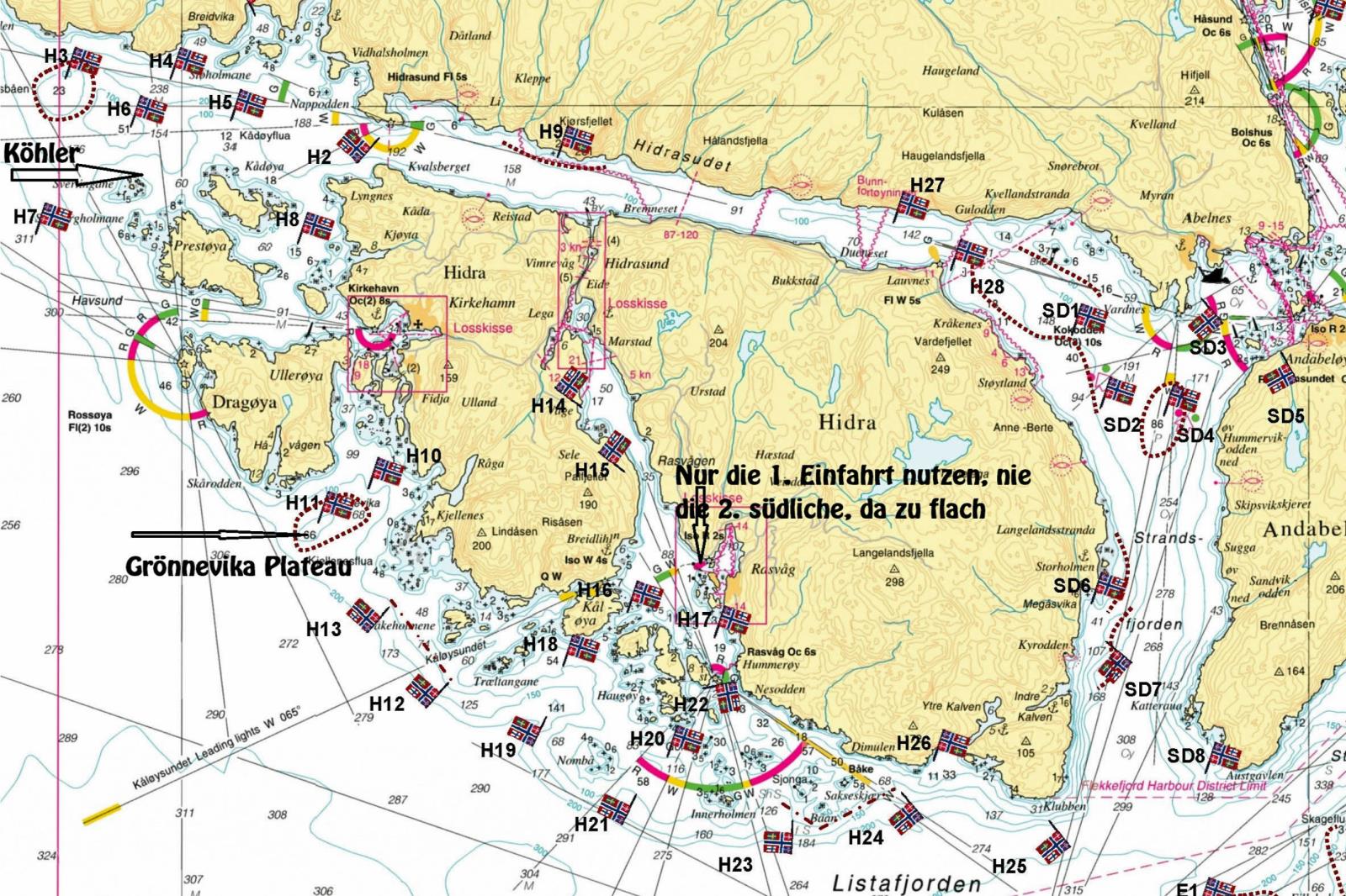 Auf der Strecke gibt es automatische Mautstellen. Bitte melden Sie sich bei autopass.no an und registrieren dort ihr Fahrzeug. Falls Sie ohne Registrierung durch die Autopass-Spuren fahren möchten, erhalten Sie bzw. der Halter später eine normale Maut-Rechnung über die angefallenen Gebühren. Verlassen sie die „E39“ an der Ausfahrt Flekkefjord und fahren geradeaus durch den Kreisverkehr in Richtung Ortskern. Wenn Sie in den Ortsbereich Flekkefjord kommen, liegen gleich links an der Ortsdurchfahrt zwei Tankstellen, dahinter befinden sich mehrere Einkaufsmärkte (Coop, Spar, Rema 1000, KIWI), die in der Woche bis 21 bzw. 22.00 h geöffnet haben. In Flekkefjord folgen Sie ca. 5 KM immer weiter der Straße 44, am Hinweisschild Abelnes/Hidra biegen sie auf die Straße 469 nach Kvellanstrand / Hidra ab. (Hinweisschild)