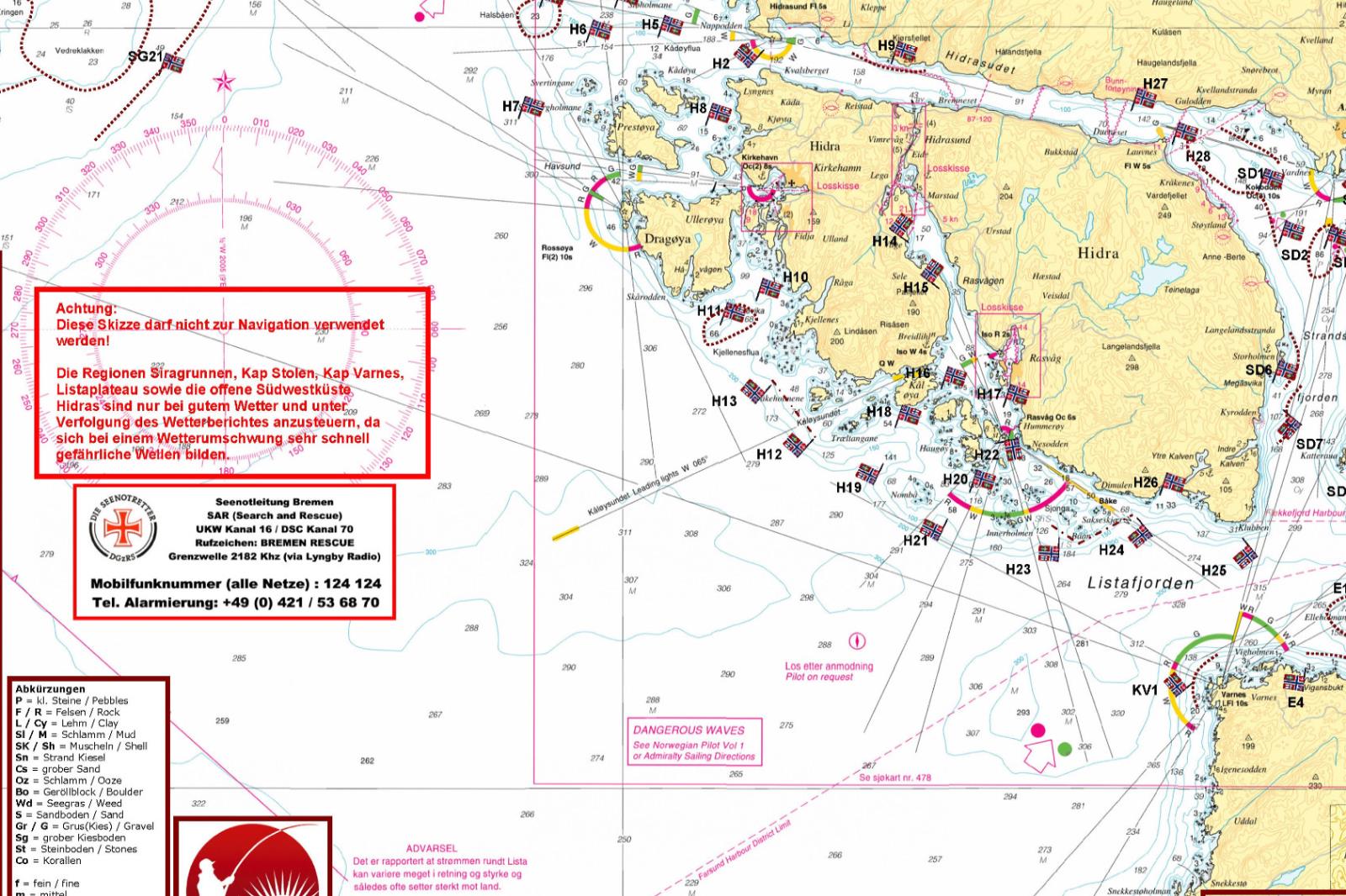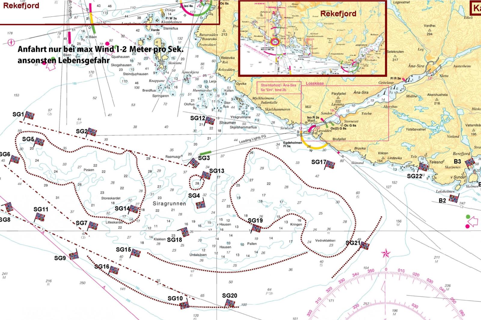 Zu den Fischzuchtanlagen oder ähnlichen Einrichtungen ist ein Mindestabstand von 100 Metern einzuhalten. Nichtbeachten der Seefahrtregeln kann zu sofortiger Beendigung des Mietverhältnisses durch den Vermieter / Eigner führen. Ansprüche des Mieters gelten damit als verwirkt.