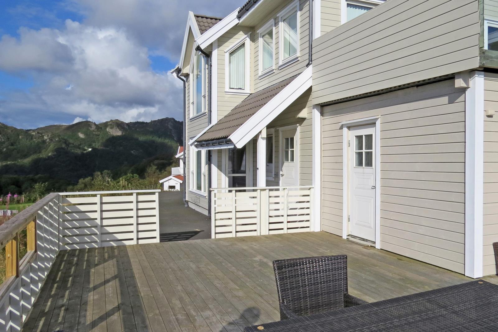 Ferienhaus in Fjell-Lage mit Meerblick, große Terrassenanlage mit Grill und Möbeln, eigener Bootsliegeplatz in Kirkehamn mit PKW-Stellplatz direkt vor dem Anleger, Fischreinigungsplatz am Boot. Ihr Fahrzeug steht auf einem Parkplatz direkt am Haus.