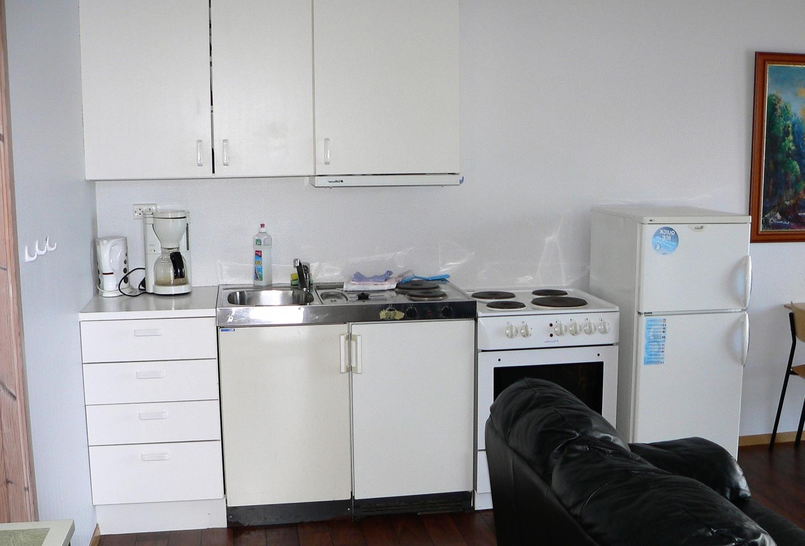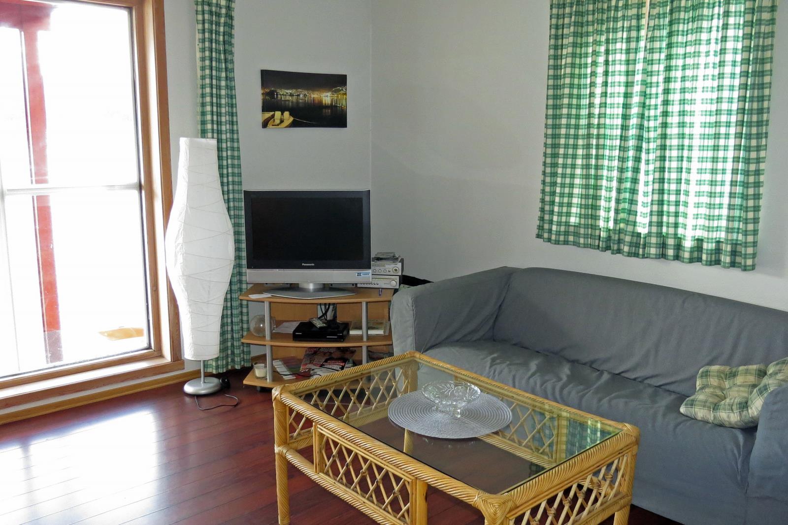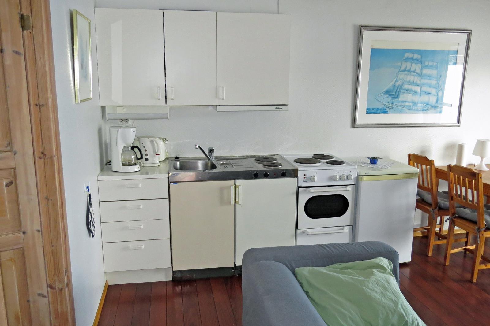 1 Wohnbereich mit kleiner Küche, Herd, Kaffeemaschine, Wasserkocher, Kühlschrank, Gefriertruhe etc., komplett ausgestattet, Der Wohnbereich ist mit TV und Internet (W-Lan) ausgestattet.