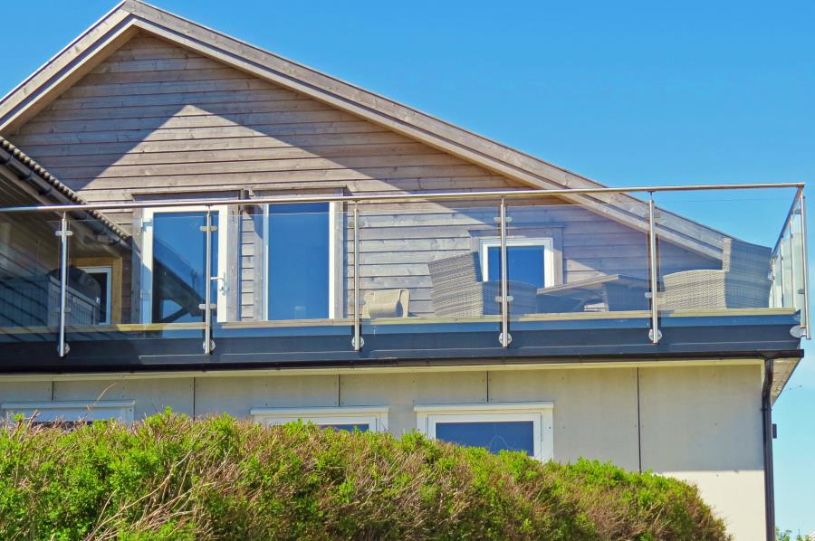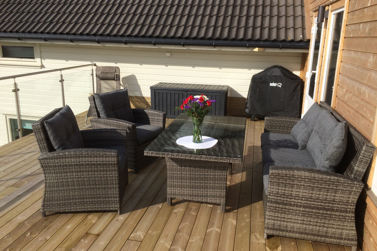 Aus der Wohnung führt ein Ausgang auf Ihre große Dach-Terrasse mit Aussicht in Richtung Meeresbucht. Passende Gartenmöbel, Liegestuhl und Gasgrill sind vorhanden. Die große Terrasse ist mit einergeländerhohen Glasabtrennung als Wetterschutz abgeschirmt. Zudem können Sie 3 Fahrräder kostenlos nutzen. Neu: Nun auch Balkon zum Südwesten