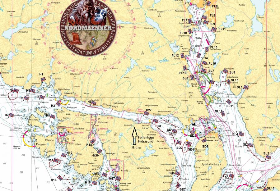 Genau gegenüber auf der anderen Fjordseite befinden sich Lachaufzuchtnetze, bitte halten Sie mit dem Boot mind. 100 Meter Abstand von diesen Anlagen. Vom Hidrasund aus, der aus den Fjorden ins offene Meer in Richtung Siragrunnen verläuft, und der die gewaltigen Felsmassive von der Insel trennt, haben Sie mit dem Boot alle Möglichkeiten, in den angrenzenden Fjorden (Strandsfjorden, Stolsfjorden, Flekkefjord) oder auf dem offenen Meer zu angeln. Angeln sollte hier bei jedem Wetter möglich sein.