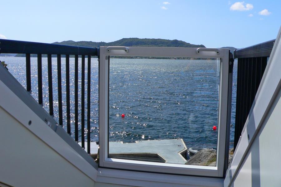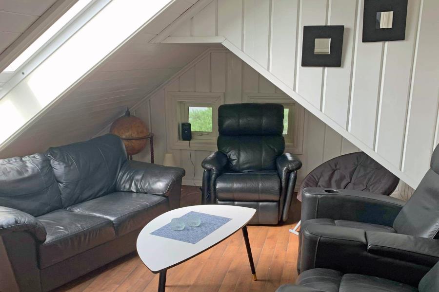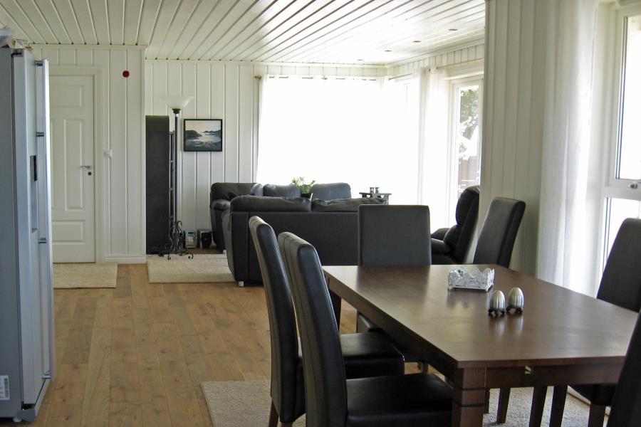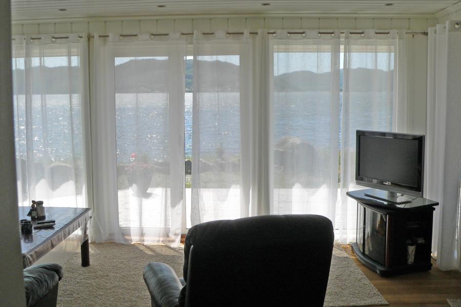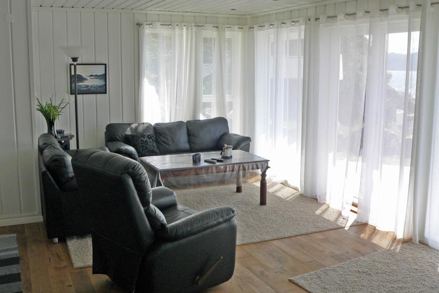 Der offene Wohnbereich verfügt über sehr große Panoramafenster mit Fjordblick. Er ist mit einer Ledersitzgruppe, TV und Radio/CD ausgestattet, sowie einem weiteren Ausgang zur Terrasse.