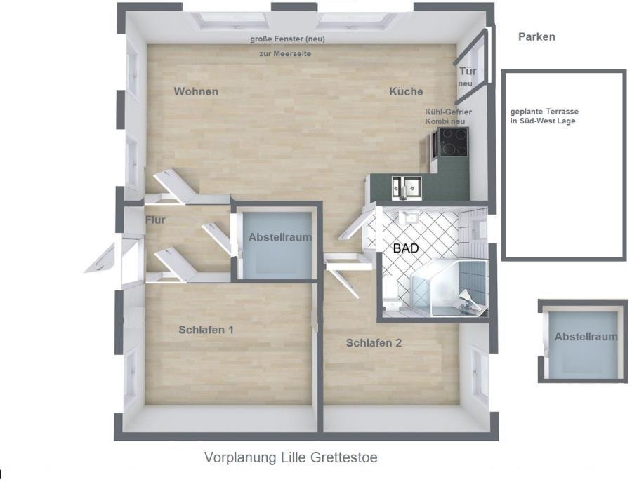 Ein eigener, abgeschirmter Außenbereich mit einer großen Südwest-Terrasse, Windschutz und Gartenmöbeln, sowie einem verschließbaren Gartenhaus mit Kühltruhe lädt zum Verweilen ein und sorgt für Privatsphäre. Parkmöglichkeiten direkt am Haus sorgen für maximalen Komfort.