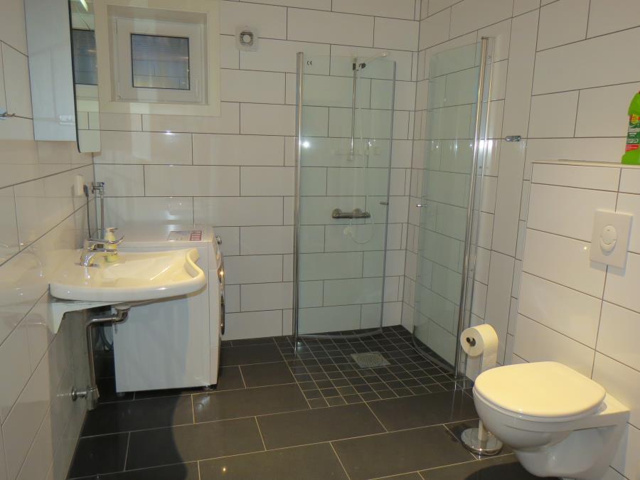1 geräumiges Bad mit WC, Dusche, Waschtisch, Waschmaschine.
