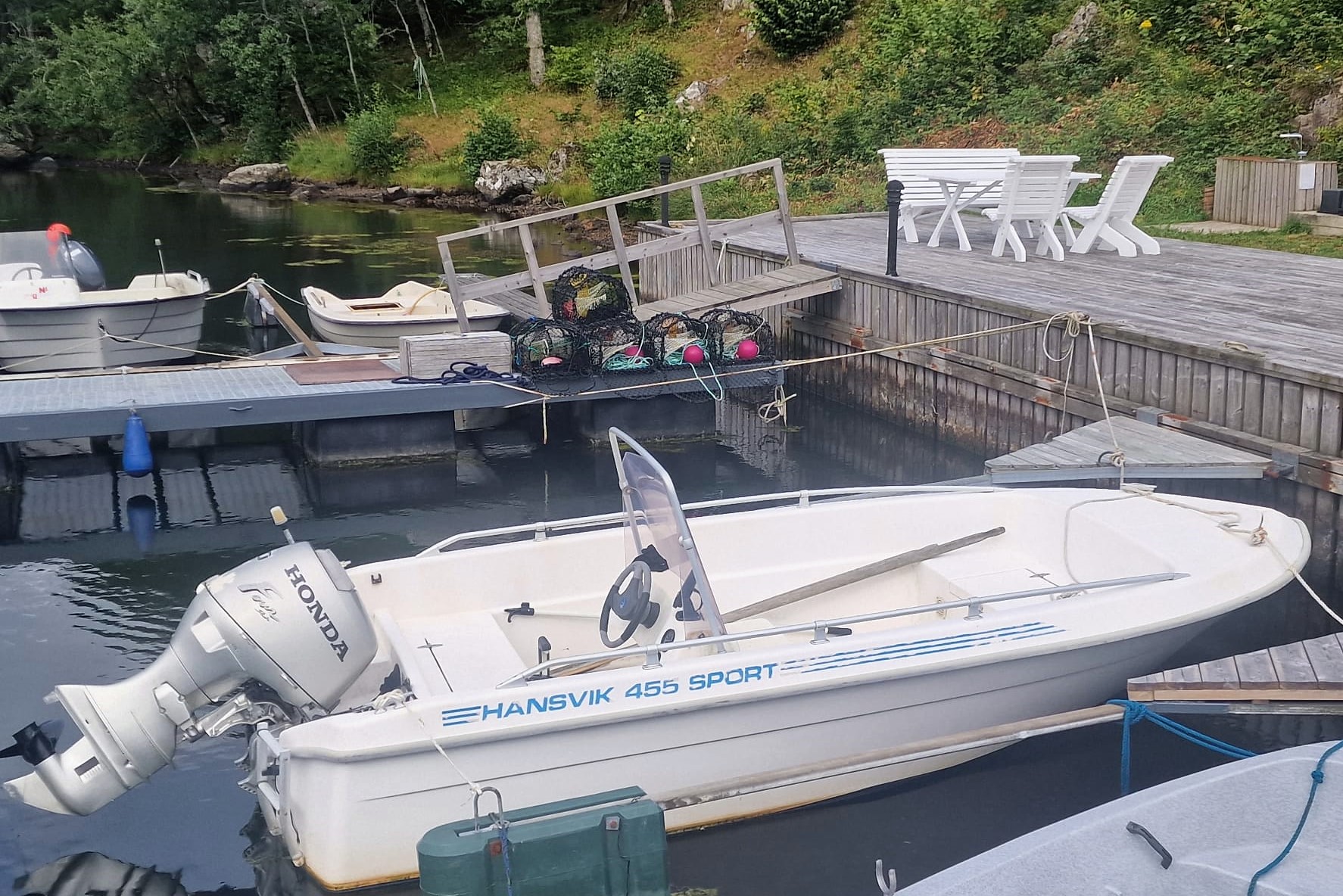 Technische Daten: 530 cm Länge, bis 6 Personen zugelassen, Motor Yamaha 4 Takt der neusten Generation, Kategorie C. Schwimmwesten / Hilfen sind für fast alle Größen vorhanden. Das Boot liegt an der großen Steganlage unterhalb des Hauses. Bootsschuppen des Eigentümers am Hidrasund oder am Bootsanleger in Kirkehavn.