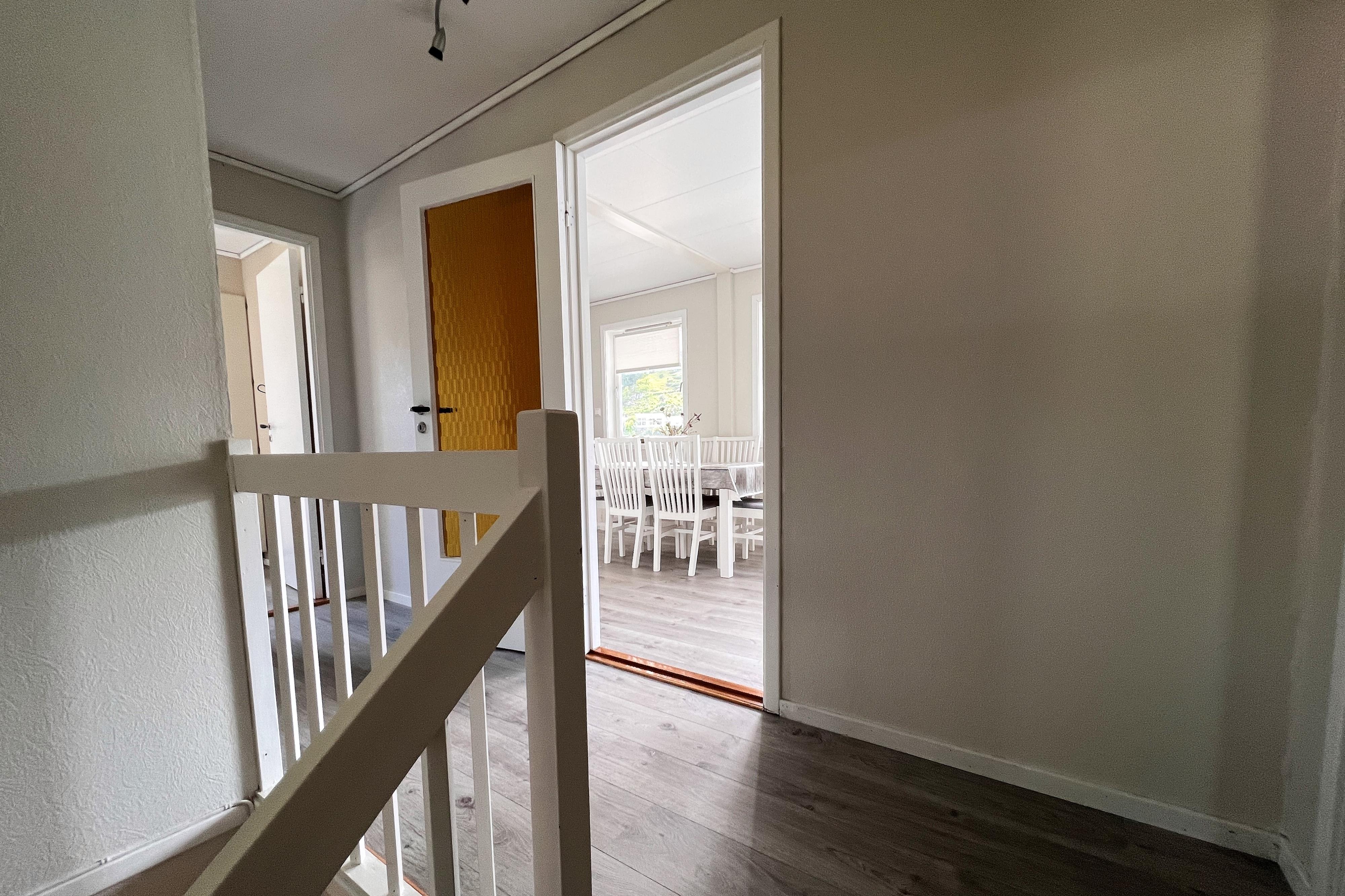 Wohn-Essbereich mit Einbauküche, Geschirrspüler, Dunstesse, Backofen, Kaffeemaschine, Toaster, Microwelle, Kühlschrank, Küche komplett ausgestattet, Radio, Internet WLAN, Essgruppe etc., Holzofen, Bakon im OG zum Fjord, 2 Schlafzimmer, 1 x Bad mit Waschtisch, Dusche u. WC, Fußbodenheizung, Wärmepumpe.