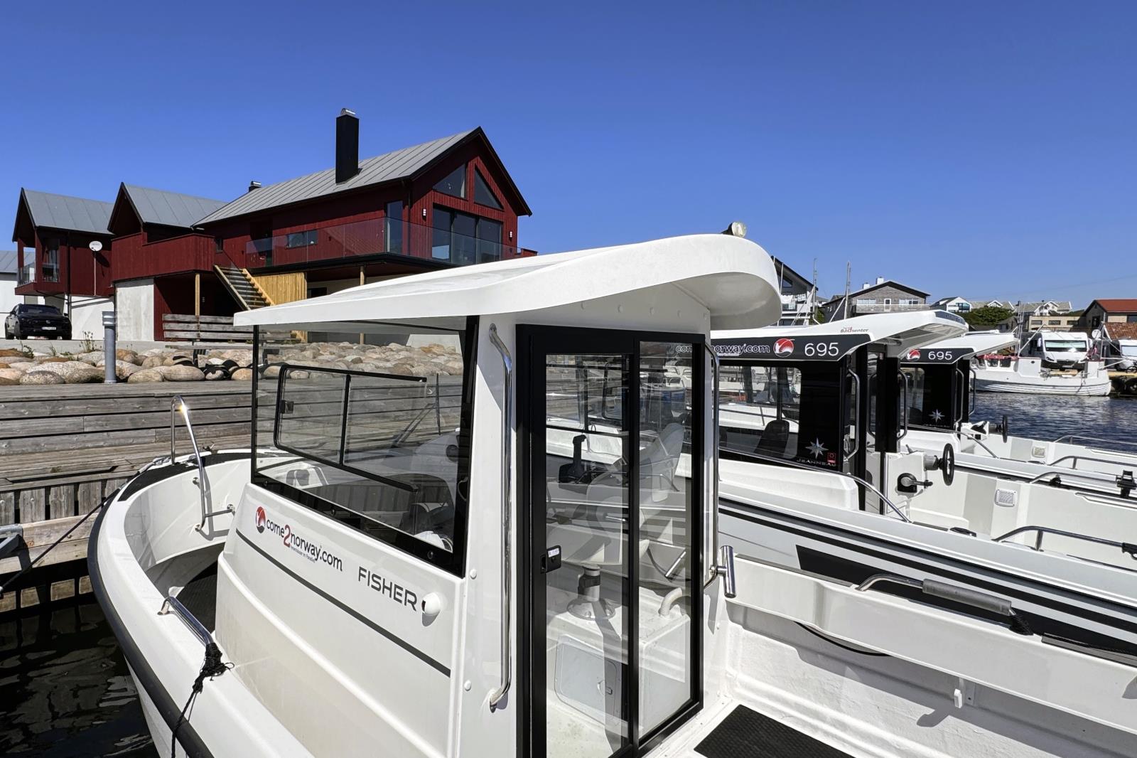 Ausstattung Boot: Außenborder Mercury 150 PS (sparsamer Benziner) , Bugstrahlruder zu besseren Manövrierung im Hafen, Innen- und Außensteuerstand mit Gas-Schaltsystem. 23 ft. 7.22 m lang, 2,54 m breit, 1150 KG Eigengewicht, 2 x 75 Liter Tank Festeinbau, 9,2 Zoll Kartenplotter/Echolot Garmin GPSMAP 923xsv, mit Garmin GT56-TM DownVü, 50/200 kHz, 1 KW Chirp, Rutenhalter, Sitze, Fischkasten, Kabine, abschließbare Schiebetür, Anker, Badeleiter, Bilgepumpe, Scheibenwischer. Das Boot ist für 4-5 Angler mit hervorragender Seetüchtigkeit perfekt zum Angeln geeignet und macht ca. 28 Knoten max. Geschwindigkeit, je nach Beladung. Das asymmetrische Smartliner Fisher erlaubt durch die seitlich versetzte Kabine den bequemen Durchgang mit Handläufen und einer hohen Reeling nach vorne zum Bugplatz mit Sitzbank und Ankerfach. Stauraum sorgt zudem für Ordnung und für eine trockene Ausrüstung. Die Seitenluken und die große Windschutzscheibe sorgen für viel Licht und Panoramablick beim Fahren.