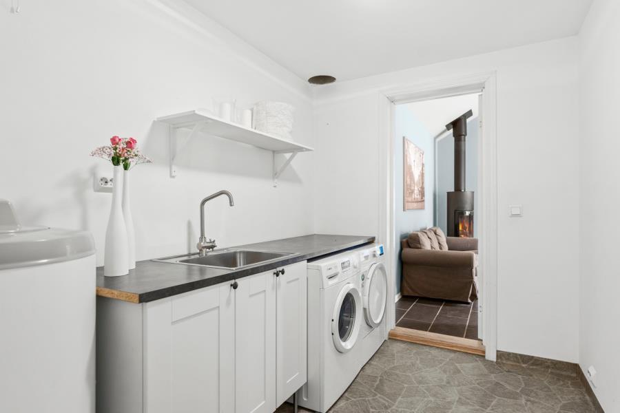1 Hauswirtschaftsraum mit Garderobenraum, Waschmaschine, Trockner, Gefriertruhe,