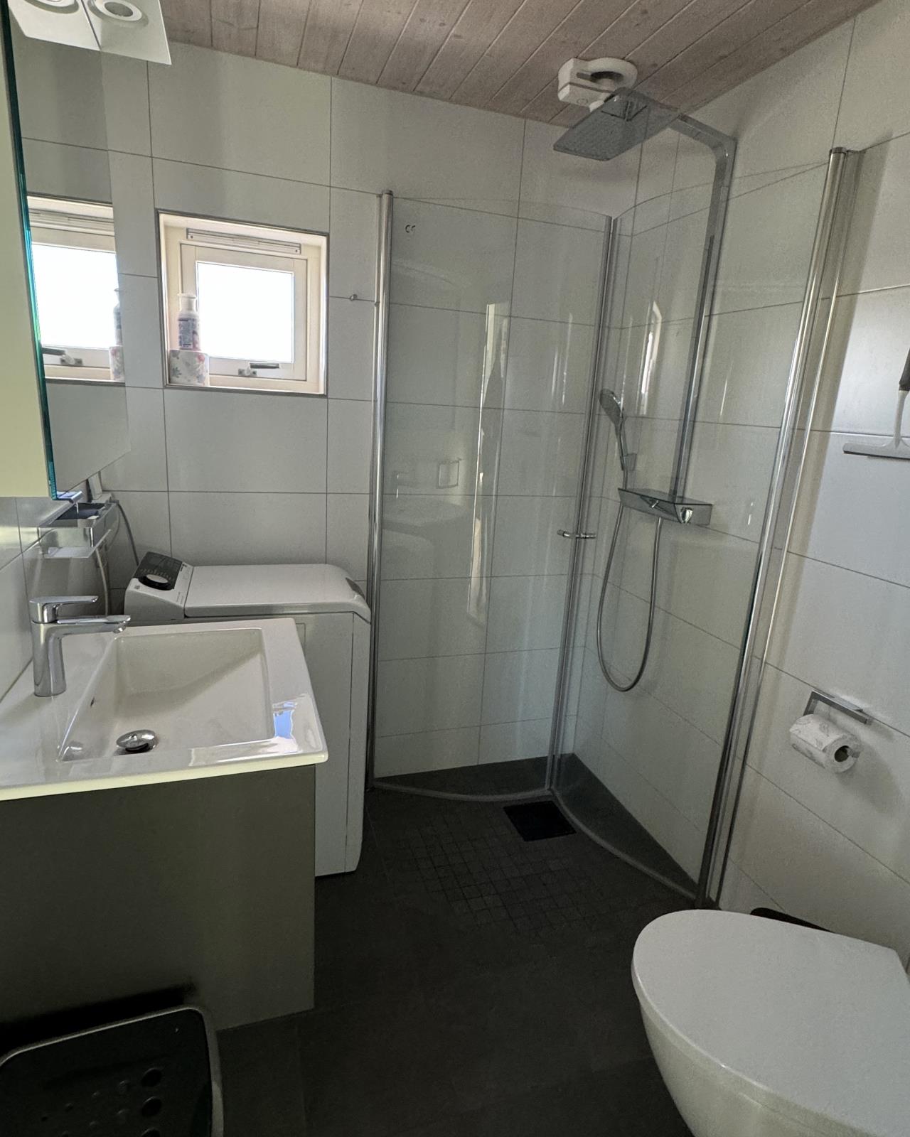 - Modernes Duschbad mit begehbarer Regen-Dusche, WC, Waschtisch und Waschmaschine.